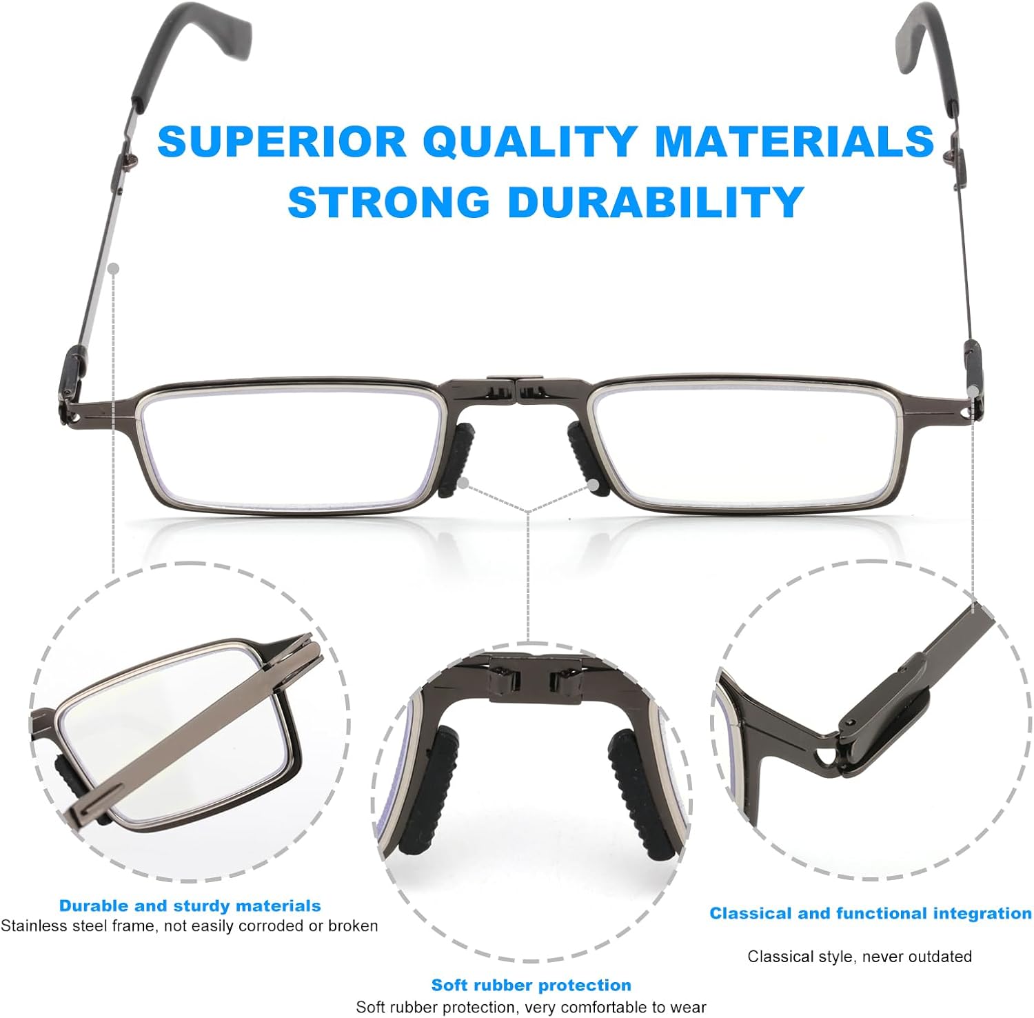 The full frame of the eyeglasses is made of superior metal material. The nose supports are designed with 2 soft rubber concave-convex strips, and the temple tips are crafted from upgraded Cellulose Propionate. These components fit snugly against the nose bridge and ears, effectively preventing the glasses from sliding during wear.