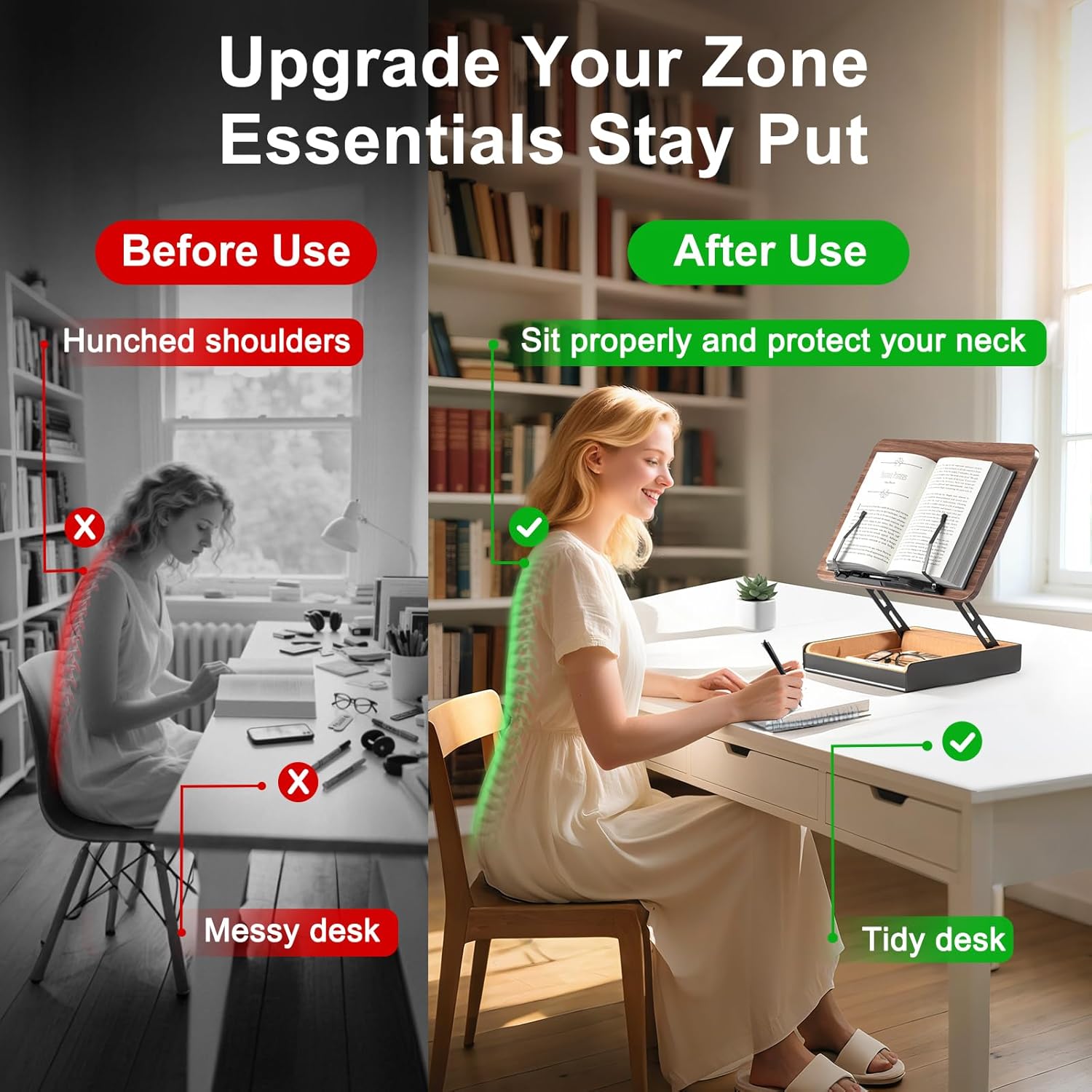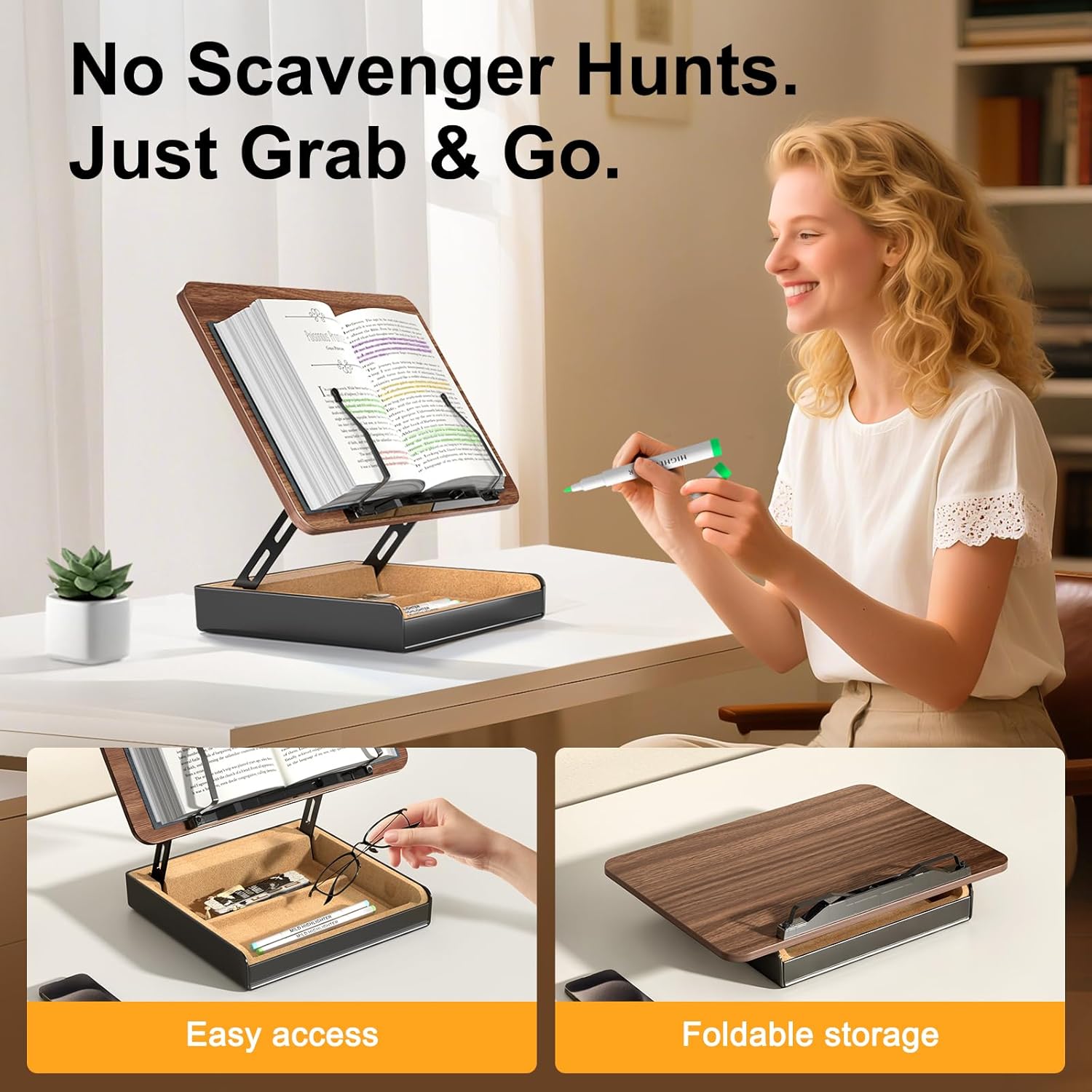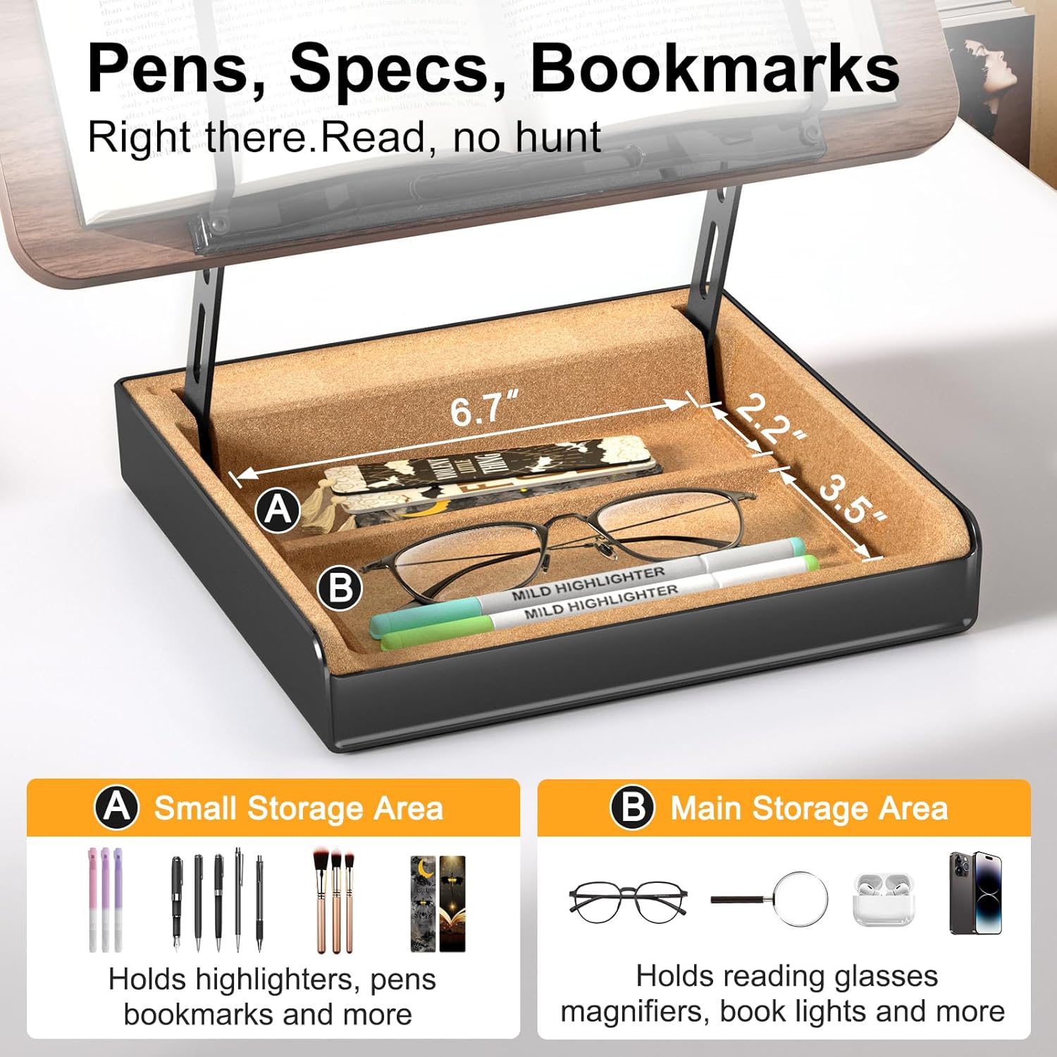 Integrated storage box keeps bookmarks, pens, and glasses within reach, ensuring uninterrupted hands-free reading and better desk organization.