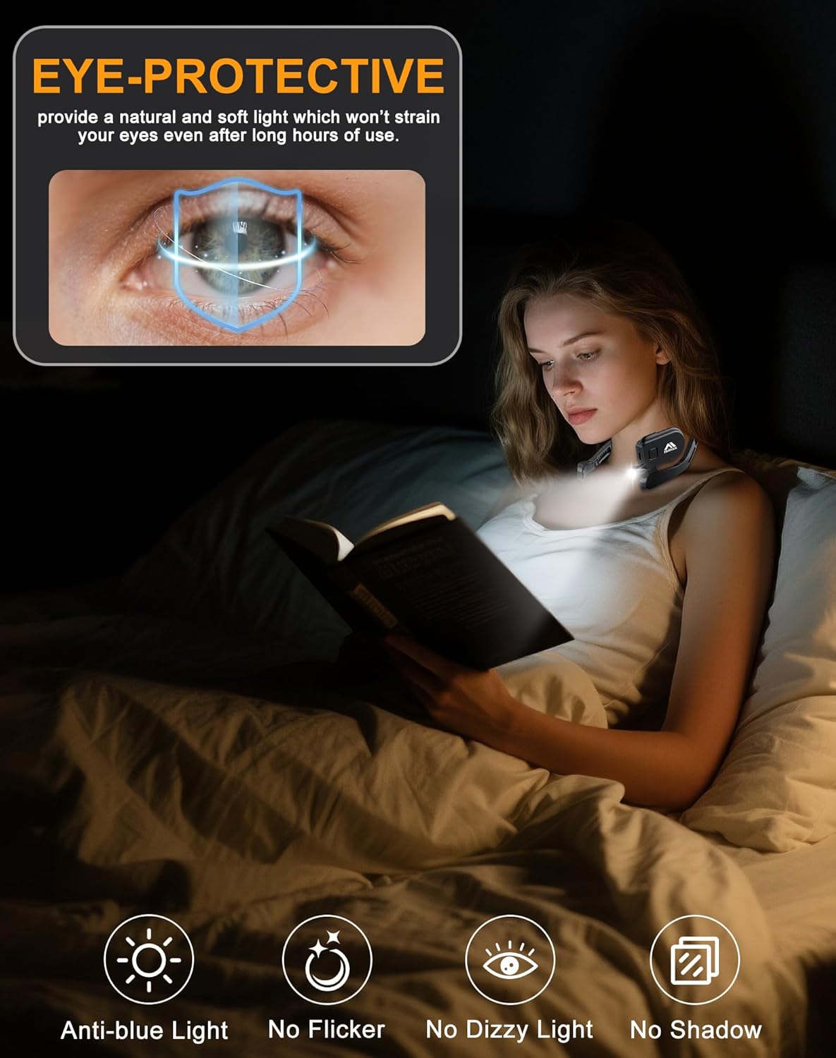 Designed for book lovers, this neck light offers three tailored lighting options: warm 3000K glow for relaxed bedtime reading, 4000K warm white for comfortable daytime use, and bright 6000K white for focused reading sessions. A quick tap on the color button switches your preferred mode, while a long hold on the brightness control lets you adjust the light level seamlessly from 10% to 100%.