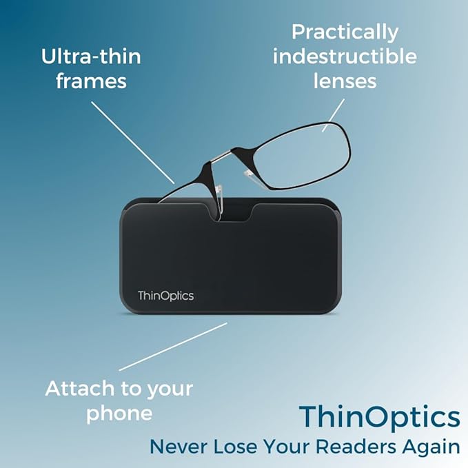 These ultra-thin, armless reading glasses fit into a slim case that attaches to your phone, tablet, or laptop, or fits into your pocket or purse. Never be without your readers again – lightweight, compact, and always within reach.